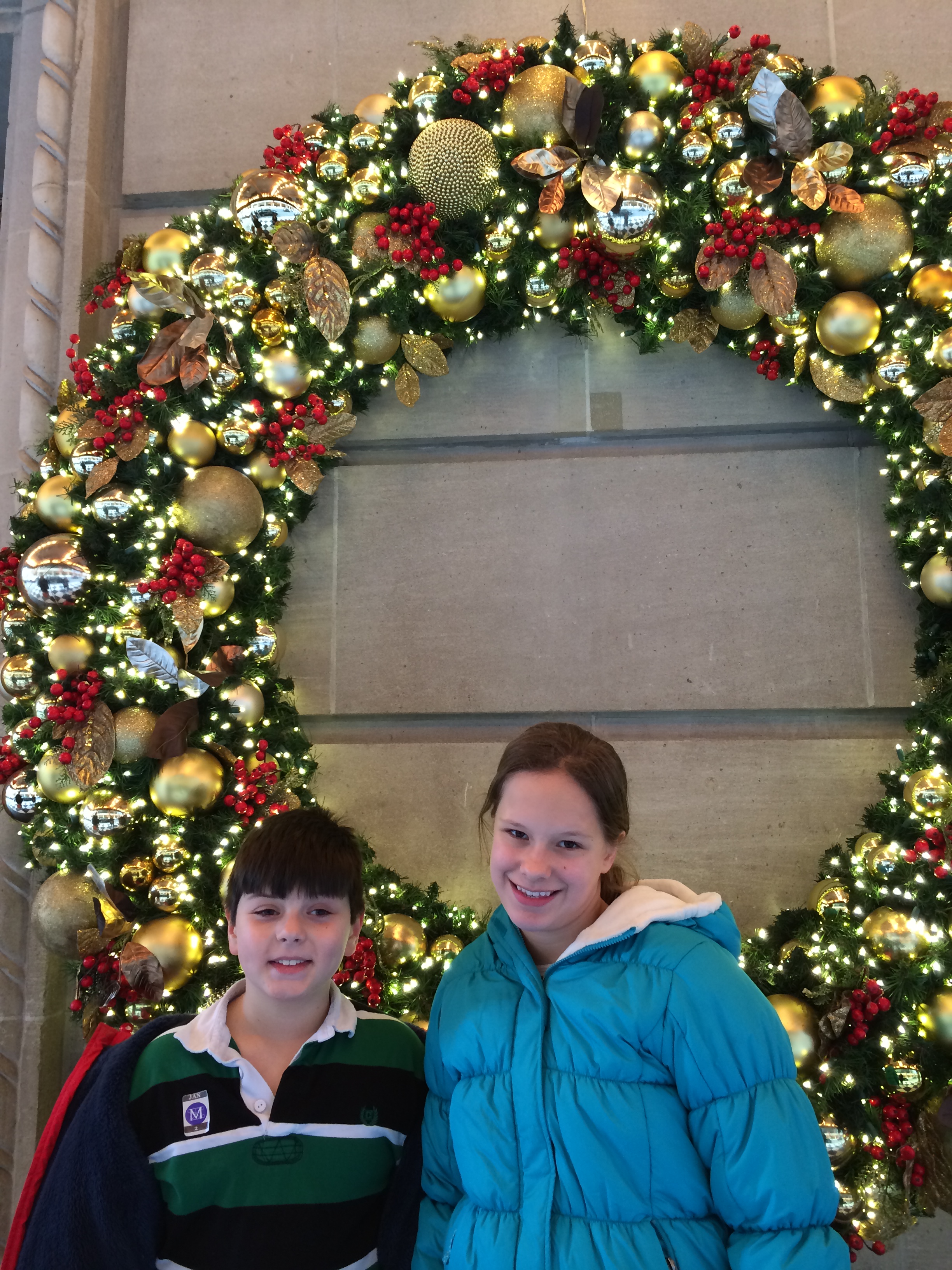 The decorations are amazing at this time of year! Here are the kids standing by a random beautiful wreath!